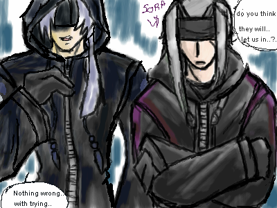 Hehe..here is Sora (from hack.sign) trying to join the Dark Brethern (from Kingdom Hearts 2)..as you can see..he would do anything to join..even dye his hair grey..~ ~;;..
